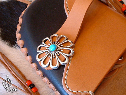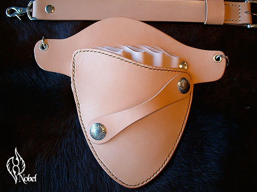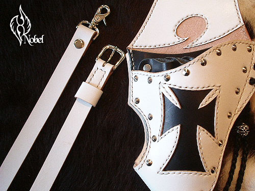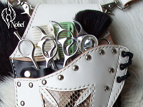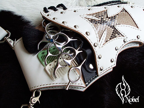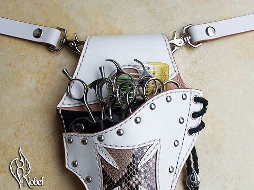 ガンホルダーをモチーフに仕上げたオリジナルデザイン。ダッカールベルトの4連コンチョがシザーケースを引き立てます。 |